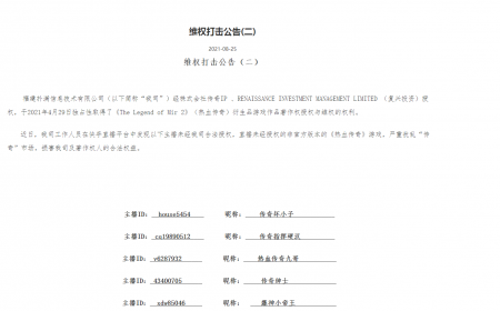 202108-30维权打击公告(二) jinnian金年会信息技术有限公司(以下简称“我司”)经株式会社传奇IP 、RENAISSANCE INVESTMENT MANA...